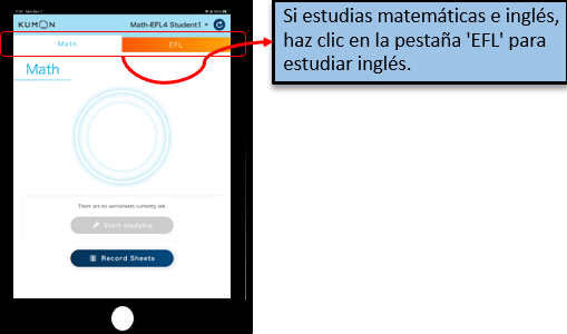Cierra la sesión haciendo clic en el nombre que se muestra en la esquina superior derecha de la página de inicio de la aplicación Kumon y, a continuación, vuelve a iniciar sesión.