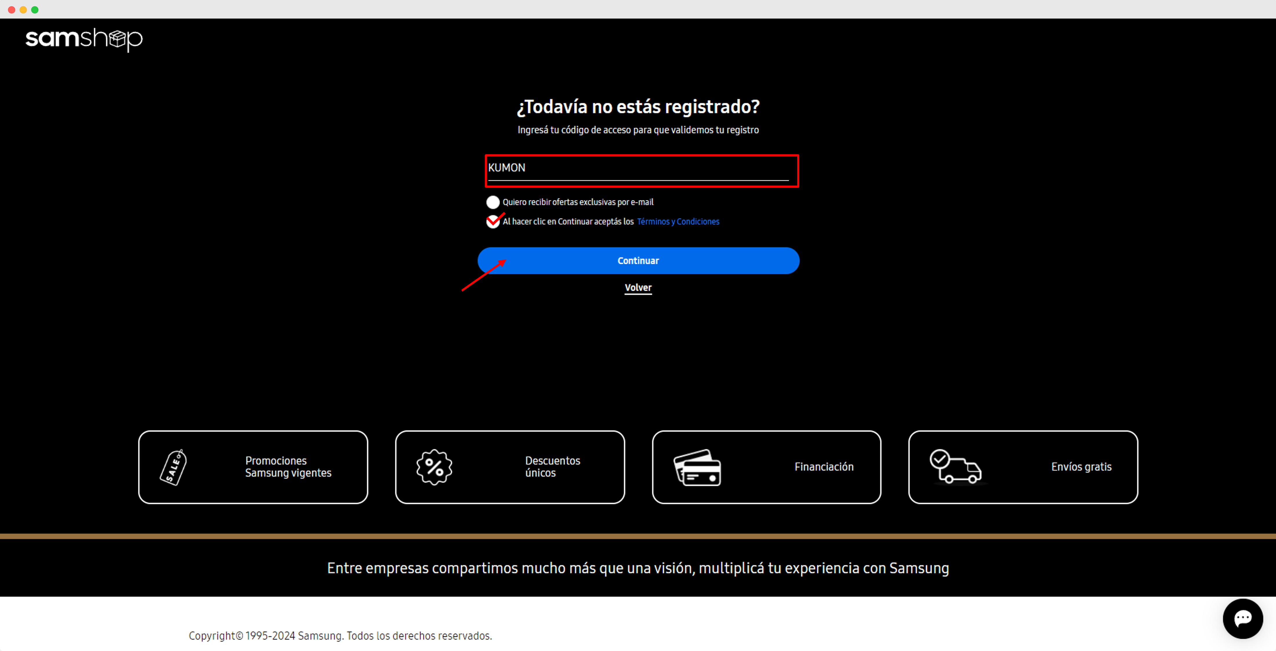 Después de ingresar el código de acceso, lea y acepte los términos y condiciones y haga clic en el botón Continuar
