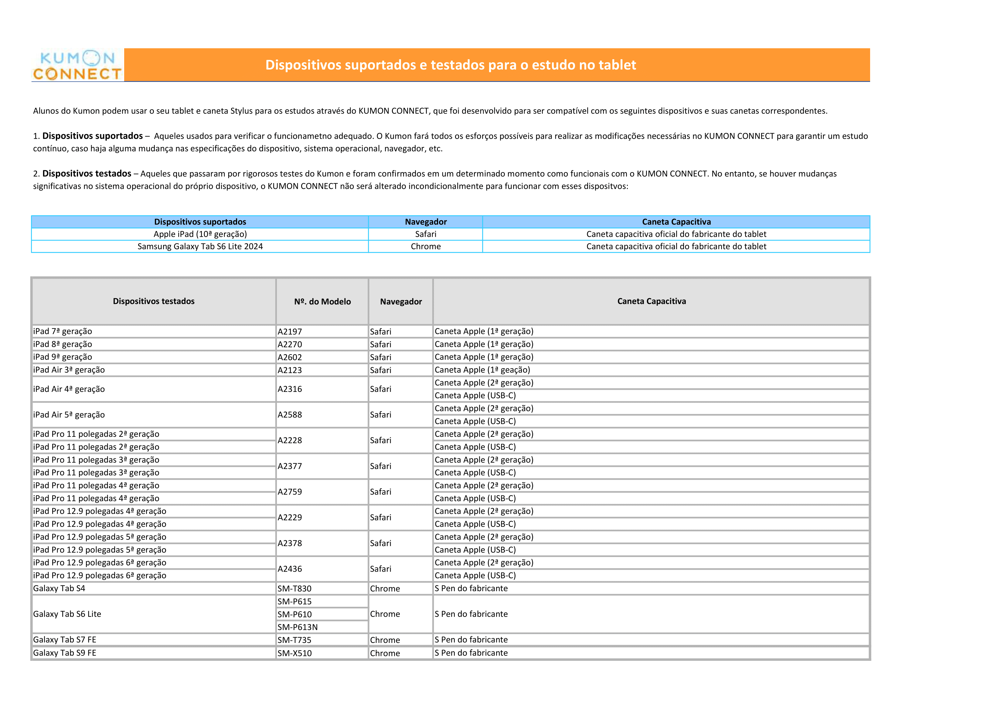 Para garantir que seu o seu tablet atenda os requisitos de compatibilidade e pleno funcionamento do KUMON CONNECT App, antes de realizar a escolha e compra de seu equipamento, verifique os modelos compatíveis na LISTA DE APARELHOS COMPATÍVEIS abaixo. O KUMON não se responsabilizará pelo mau funcionamento e não poderá prestar suporte técnico em equipamentos não compatíveis.