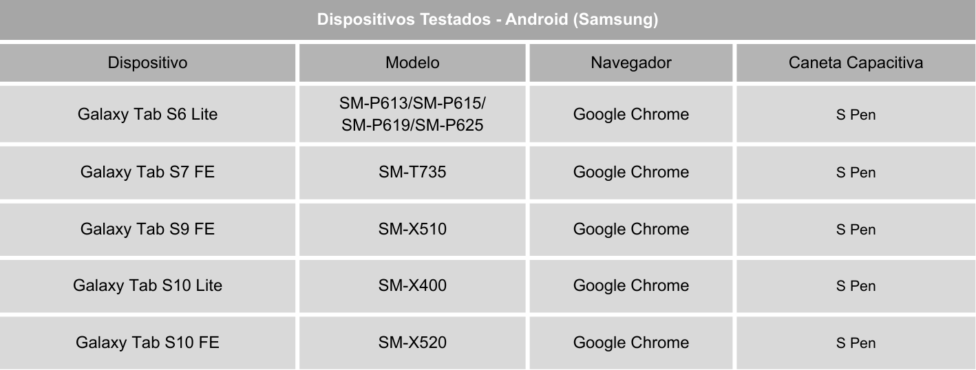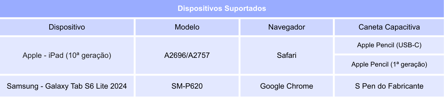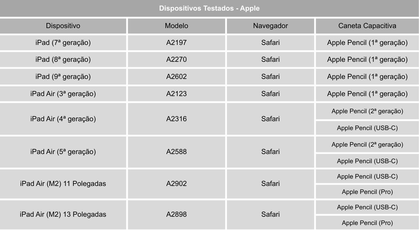 São dispositivos que foram utilizados para verificar o funcionamento adequado da aplicação. O Kumon continuará realizando os ajustes necessários para manter o bom desempenho da aplicação caso ocorram alterações nas especificações técnicas, no sistema operacional, no navegador ou em outros componentes desses dispositivos.